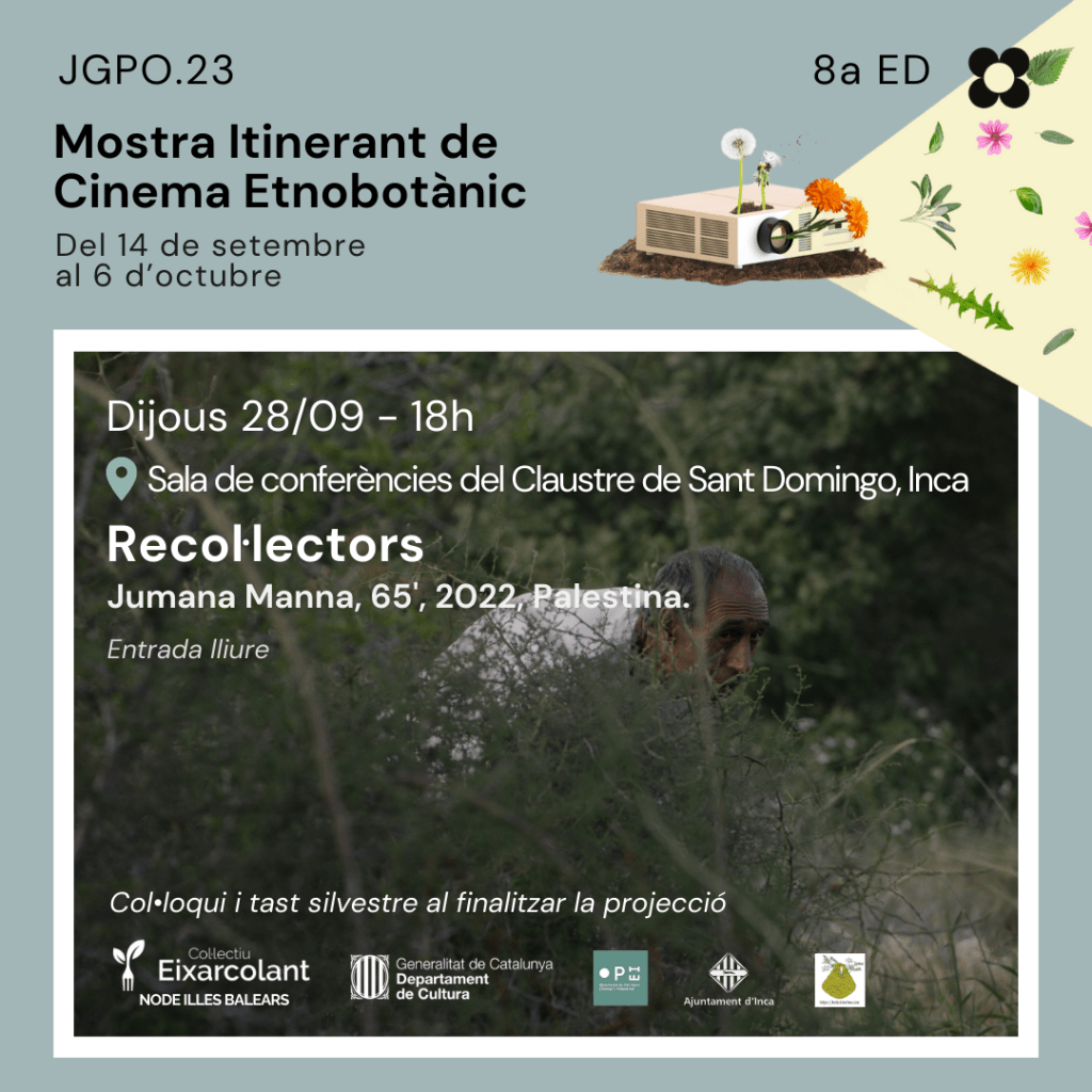 _*Recol·lectors de Jumana Manna (65′, Palestina, 2022)*_ es pregunta: com alimentar la família quan vius en un territori ocupat i les lleis prohibeixen recol·lectar aliments silvestres? Aquest és el drama que compta aquesta pel·lícula Palestina, amb humor i ritme meditatio. Les restriccions prohibeixen la recol·lecció d”akkoub i za’atar (farigola), i plantes similars a les carxofes, i han resultat en multes i judicis per a centenars de persones atrapades recol·lectant aquestes plantes natives. Seguint les plantes des de la natura fins a la cuina, des de les persecucions dels recol·lectors fins a les defenses als tribunals, aquesta pel·lícula captura l’alegria i el coneixement encarnats en aquestes tradicions, que ara són resistència.